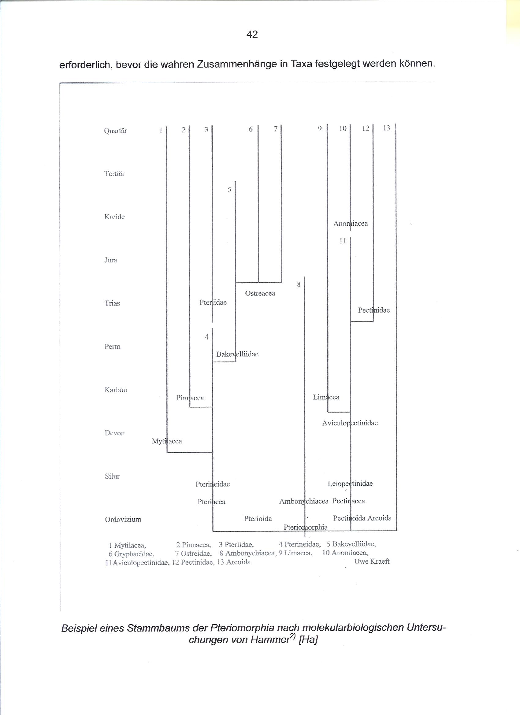 Über die molekularbiologische Verwandtschaft der Bivalvia gibt es folgende zusammenfassende Darstellung: Sabine E. Hammer, Molekulare Phylogenie der pteriomorphen Bivalvia (Mollusca), (2001), Dissertation, Institut für Zoologie, Universität Wien. Die dort aufgeführten umfangreichen Ergebnisse stellen eine bedeutende Bereicherung in der Suche nach einer Klassifikation und einem Stammbaum der Bivalvia dar. Allerdings fehlt die zeitliche Einordnung. Die Mytiloida sind beispielsweise erst ab dem Devon bekannt; die Pterioida sind dagegen eine viel ältere Gruppe mit einem charakteristischen flügelartigen Erscheinungsbild, die seit dem Ordovizium bekannt ist. Ohne weiter auf Details einzugehen muss eine Klassifikation alle Merkmale berücksichtigen, das heißt neben dem inneren Aufbau (Kiemen, Muskeln, Ligament, Mantelsaum), der äußeren Form mit dem Schloss und dem Schalenaufbau auch die Ontogenese und die molekularbiologischen Erkenntnisse. Unter Verwendung der Ergebnisse von Hammer (S. 64, 91) und des Schalenaufbaus nach Taylor, Kennedy & Hall sowie der Definition der Taxa und ihrer zeitlichen Einordnung des „Treatise“ (s. oben) ergibt sich zum Beispiel das nachfolgende Diagramm [Kraeft, U. & M., Bivalvia - Bivalves - Muscheln, (2015), Shaker Verlag, Aachen]: Wenn Abb. 35 F von Hammer um 90° gedreht wird, ergibt sich folgendes: