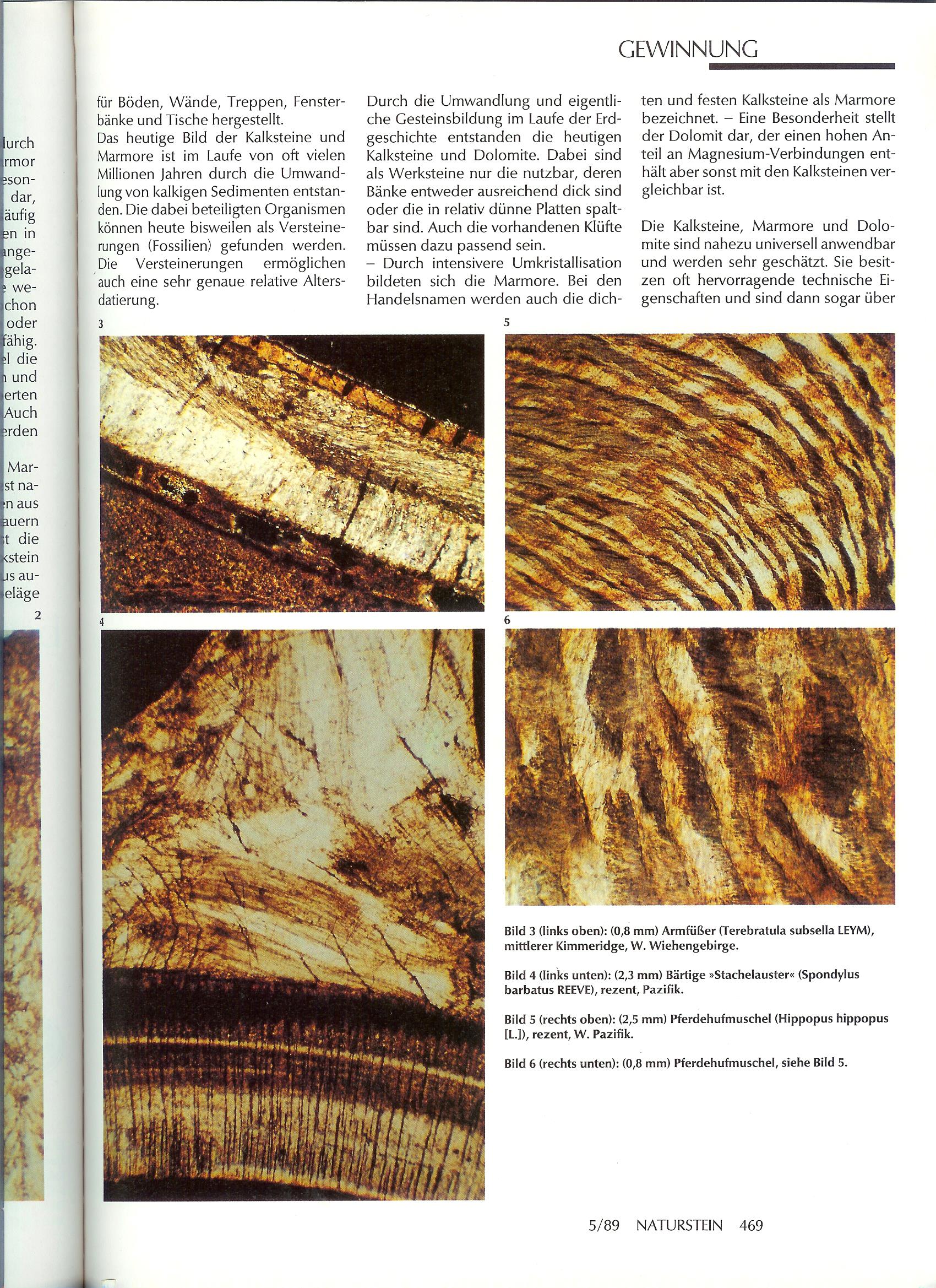 Perlmuttschicht aus winzigen Aragonit-Plättchen, die in Lagen oder übereinander gestapelt auftreten; Blätterschicht aus blätterartig verbundenen Calcit-Leisten; Prismenschicht aus polygonalen Säulen, die aus Aragonit oder Calcit bestehen; gekreuzte Lamellen (g. L.) und komplex gekreuzte Lamellen aus gegeneinander geneigten Aragonit-Kristallaggregaten; homogene Schicht aus winzigen Aragonit-Kristallen mit ähnlicher Orientierung; Myostrakum aus prismatischem Aragonit im Bereich der Schließmuskelansätze vieler Bivalvia.